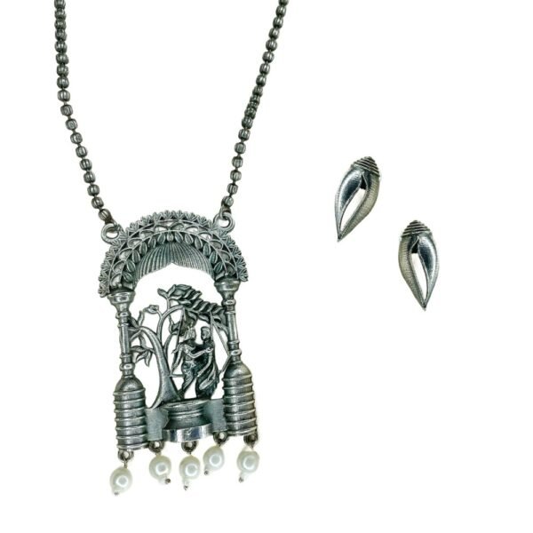 Made from premium brass and finished in oxidised silver, this long necklace features a traditional beaded chain that enhances its regal drape. The detailed pendant showcases Radha Krishna beneath a stylized tree, finished with delicate pearl danglers to add softness and movement.